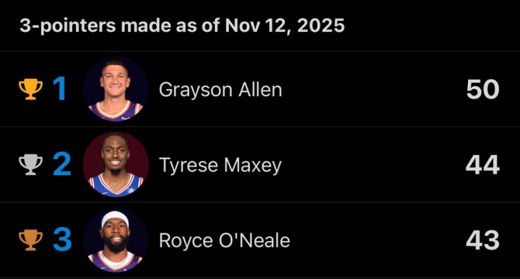 Cạnh tranh danh hiệu 3 điểm mùa này? Grayson Allen trở thành cầu thủ đầu tiên đạt 50 quả 3 điểm mùa này 2025-11-13 • Đọc tiếp 73 1. Allen đã ghi 50 bàn2. Maxey ghi được 44 bàn thắng3. Royce O'Neal đã ghi 43 bànsource:7m cn com