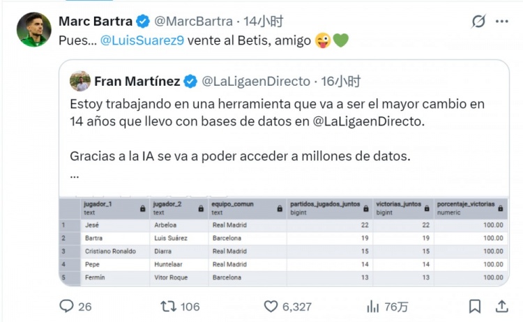 Theo thống kê từ chuyên gia dữ liệu bóng đá Fran Martínez, Bartra và Suarez đã chơi 19 trận La Liga cùng nhau trong thời gian ở Barcelona, với tỷ lệ thắng là 100%.
