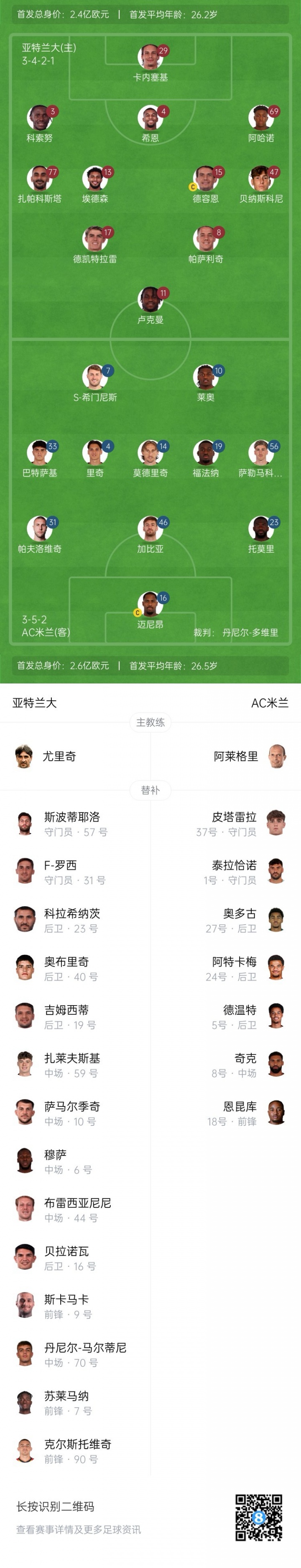 Cầu thủ thay thế Atlanta: 57-Sportiello, 31-F Rossi, 23-Klasinac, 40-Obrich, 19-Jimsiti, 59-Zalewski, 10-Samardzic, 6-Moussa , 44-Brescianini, 16-Bellanova, 9-Scamacca, 70-Daniel Maldini, 7-Suleimana, 90-Krstovich