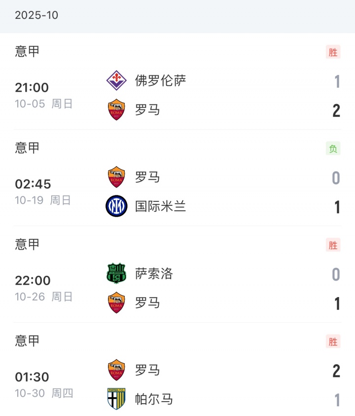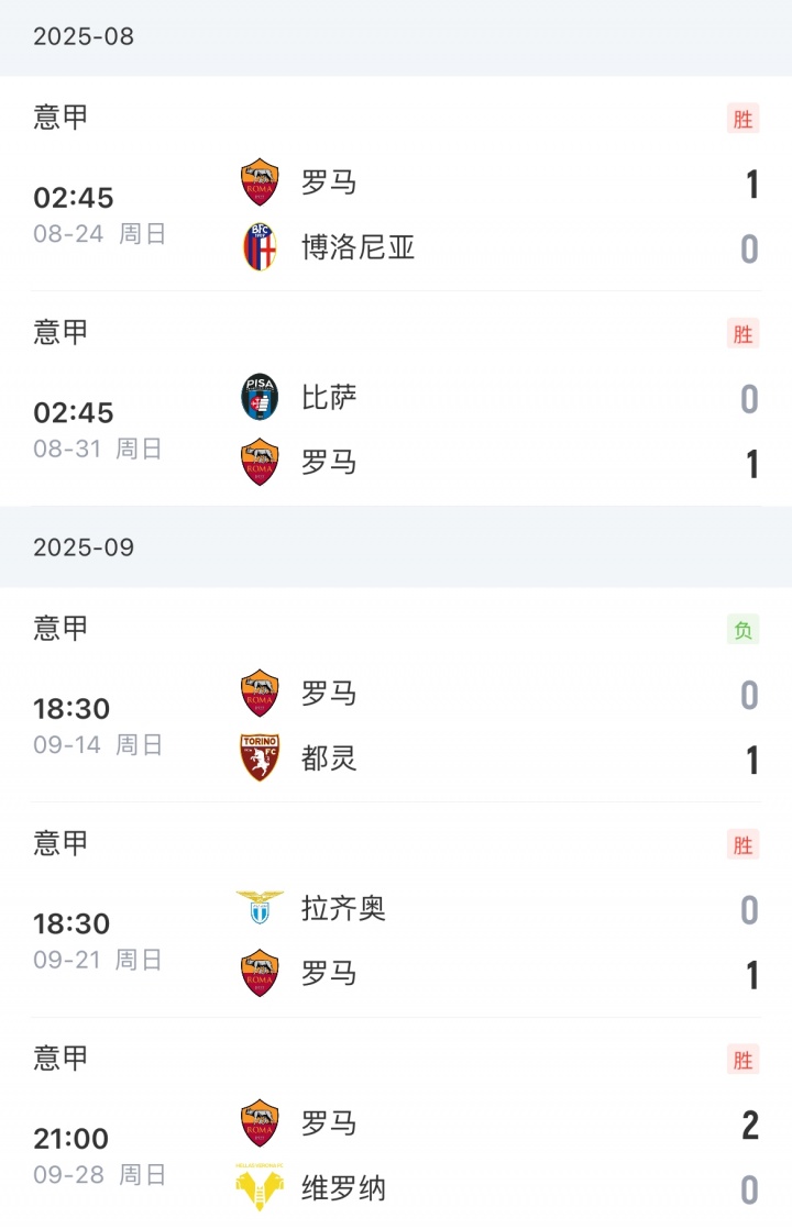 Trong hai trận thua, Roma lần lượt thua Turin và Inter Milan với tỷ số 0-1.