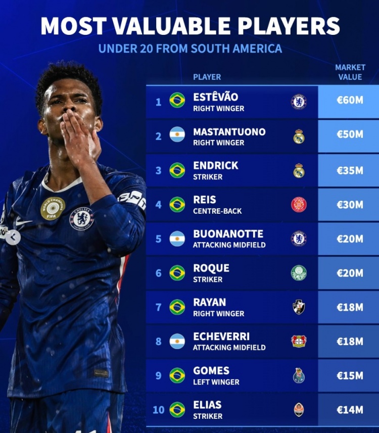 "Thị trường chuyển nhượng" đã tính toán giá trị của các cầu thủ U20 Nam Mỹ, trong đó ngôi sao Esteban của Chelsea dẫn đầu.