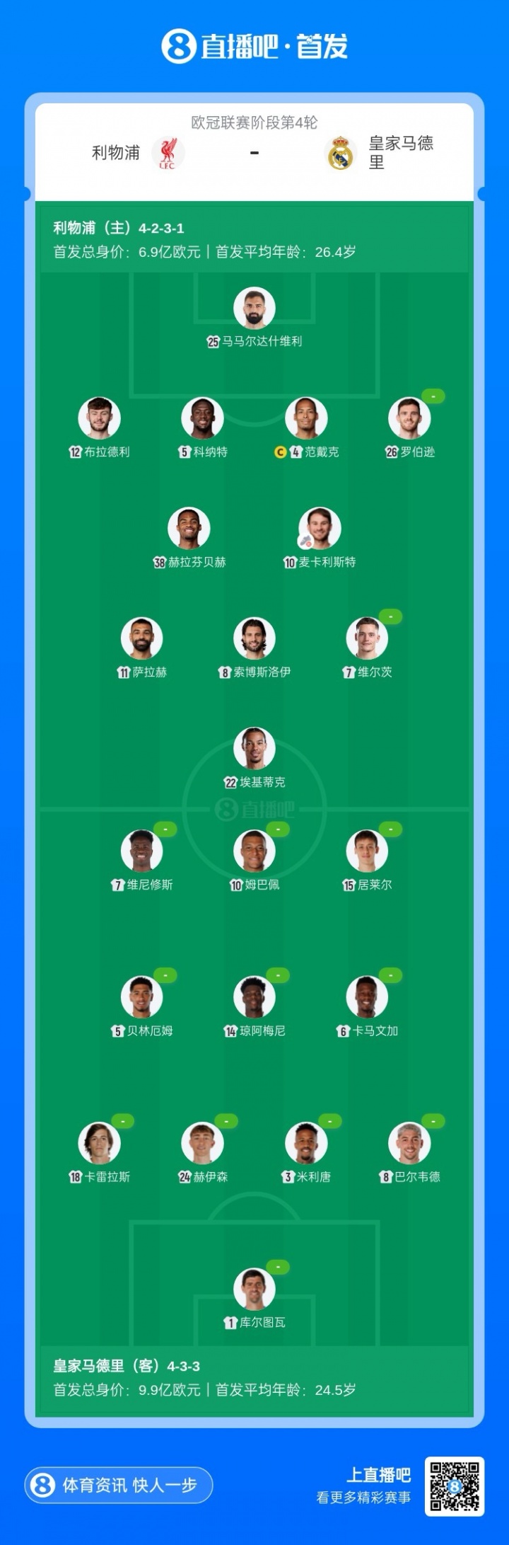 Real Madrid xuất phát: 1-Courtois, 3-Militão, 18-Carreras, 24-Huizen, 5-Bellingham, 6-Camavinga, 8-Valverde, 14-Joan Armeni, 15-Guler, 7-Vinicius, 10-Mbappé